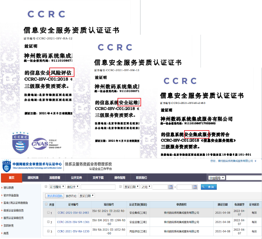 近日,神州信息获得中国网络安全审查技术与认证中心(CCRC,原中国信息安全认证中心ISCCC)授予的三项信息安全服务资质认证证书,包括“信息安全风险评估服务资质证书”、“信息安全集成服务资质证书”与“信息系统安全运维服务资质证书”。这是中国网络安全审查技术与认证中心对神州信息安全服务理念和能力的认可,标志着神州信息在赋能金融安全方面迈上了新的台阶。